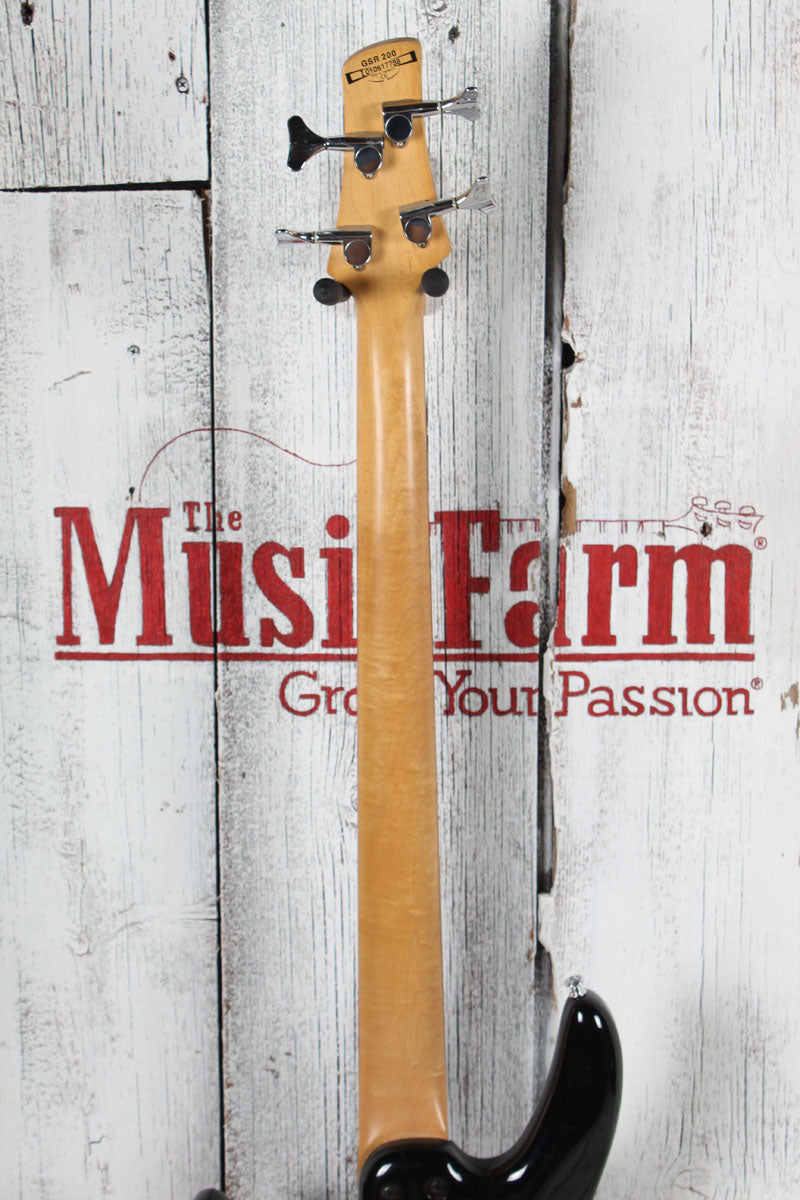 This GSR200 features a Poplar body in a Black finish, a fast, sleek and comfortable GSR4 Maple bolt-on neck with a 34" scale and a Rosewood fretboard, making this bass perfect for any beginner or for the pro who needs a reliable and affordable backup.