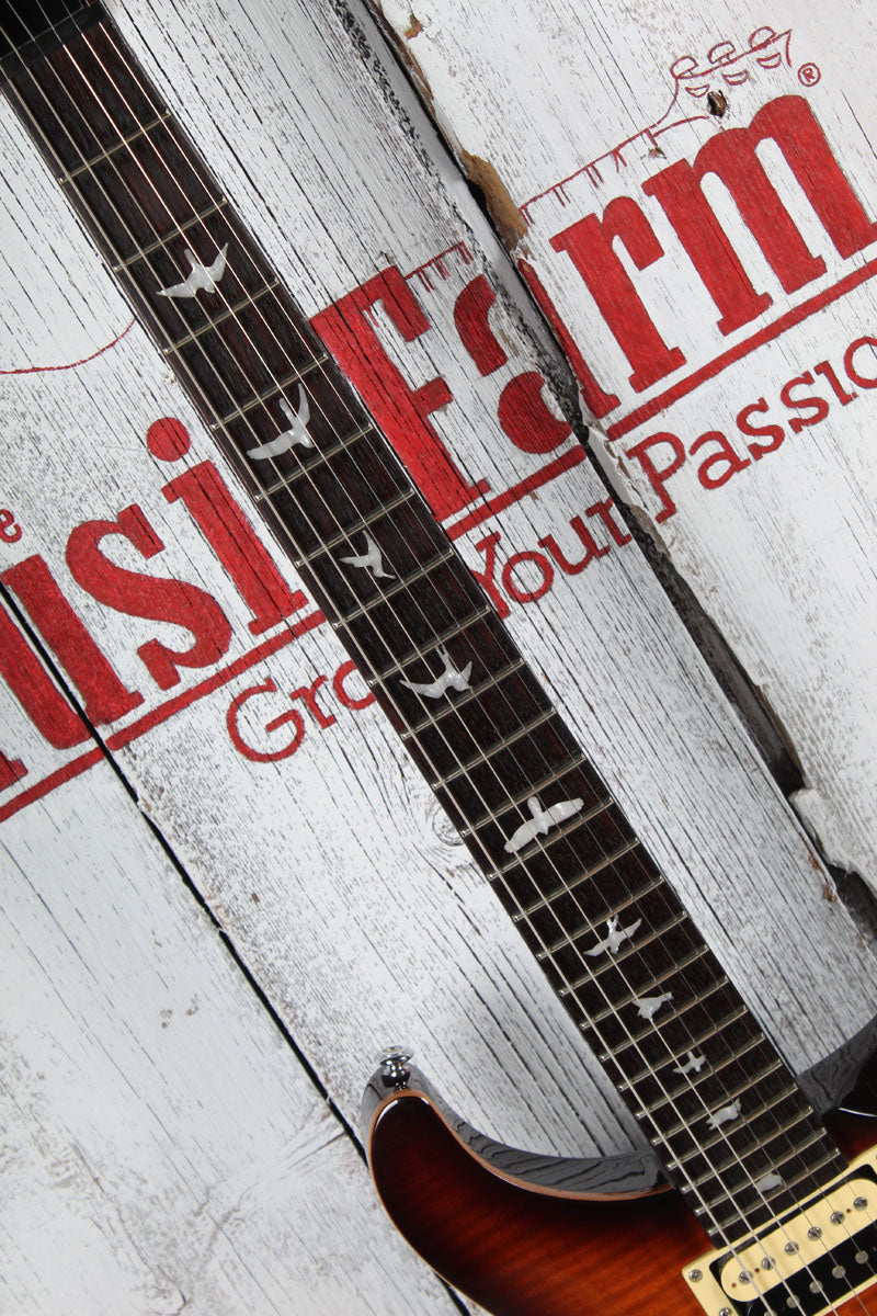 This 2014 SE Custom 24 is exceptionally stunning with its beveled Maple top with flame Maple veneer and Mahogany back and sides in Tobacco Sunburst finish. The Wide Thin set Maple neck features a 25" scale, 24 frets and a 10" radius.