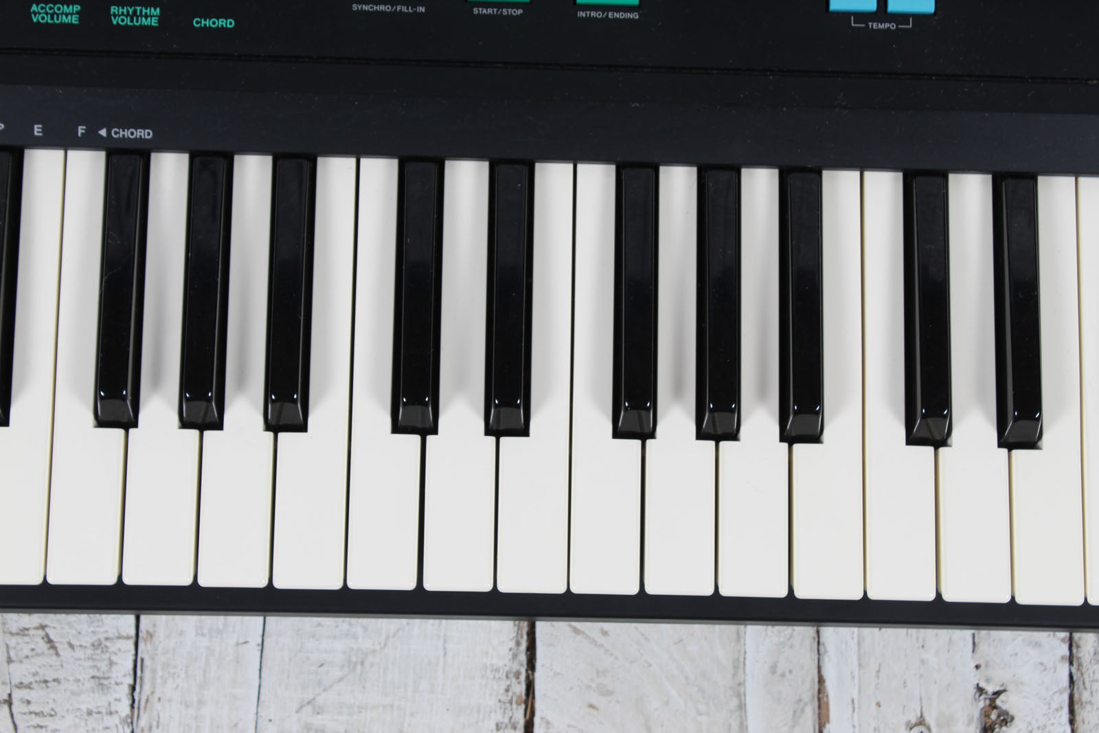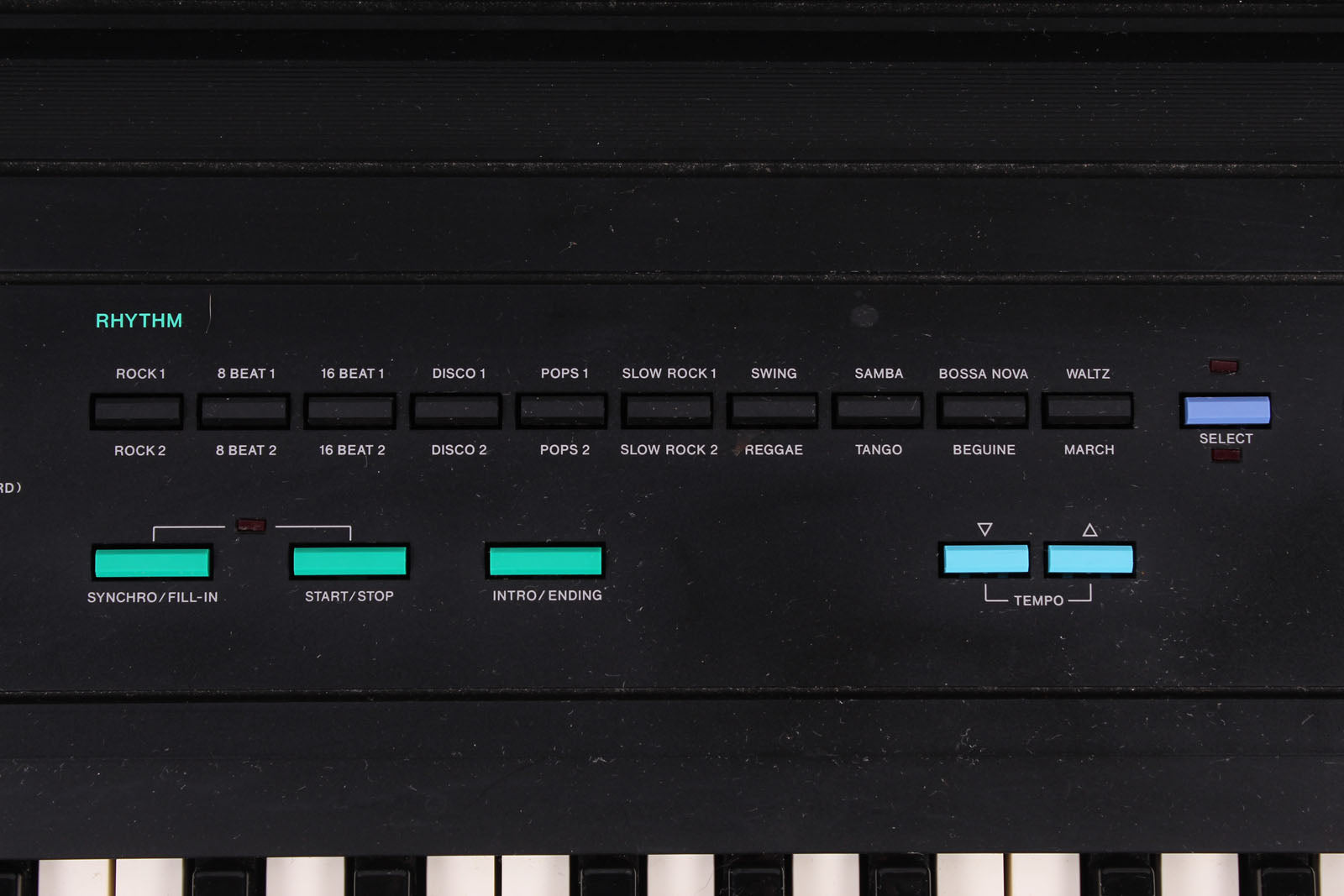 - Rhythm Controls: Tempo slider, Start/Stop, Synchro/Fill-in, Intro/Ending
